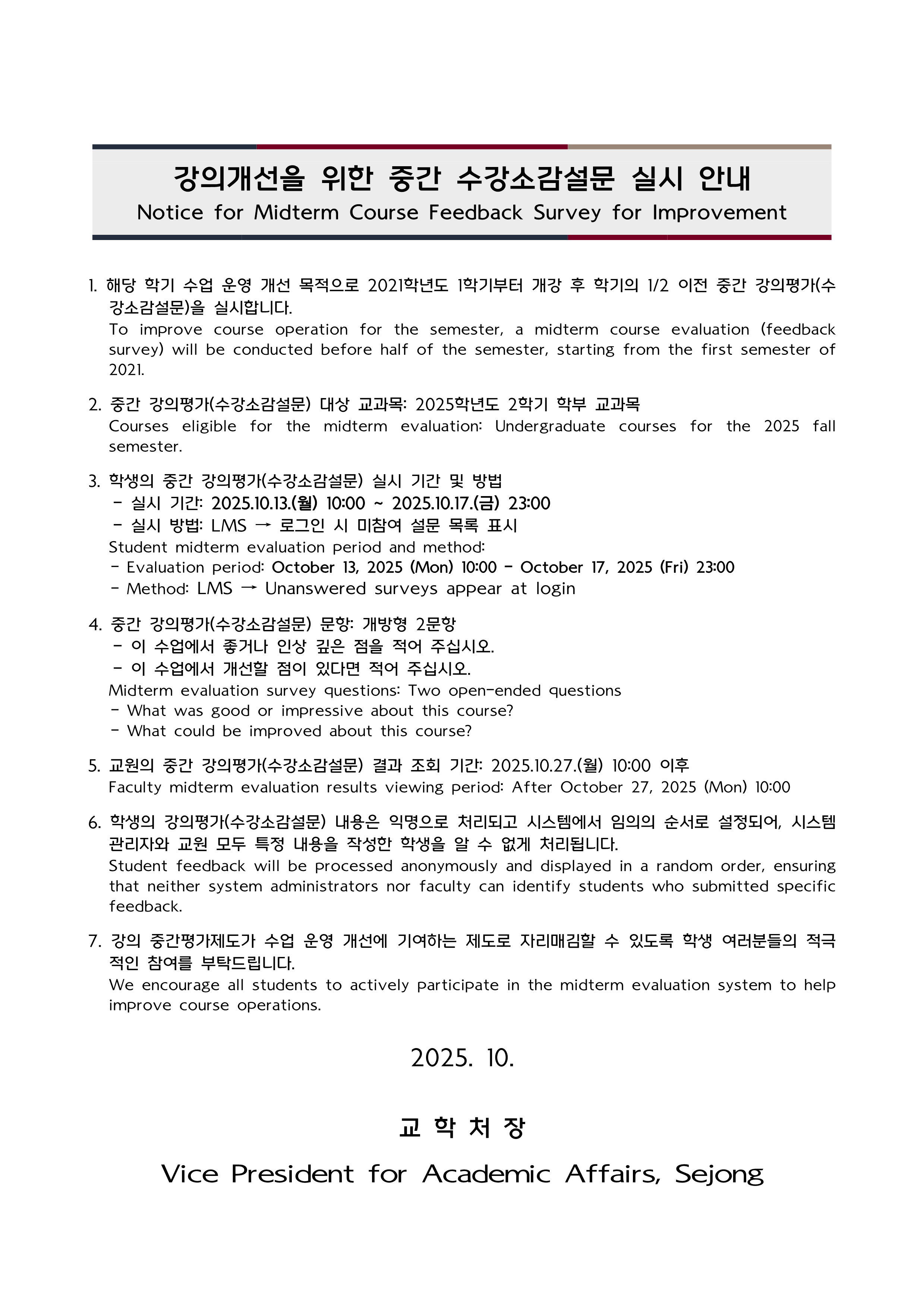[안내] 2025학년도 2학기 학부 중간 수강소감 설문 실시 안내