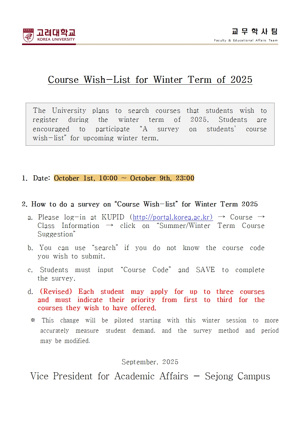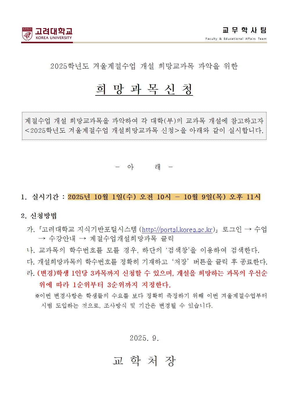 [학사] 2025학년도 겨울계절수업 개설희망과목 신청 안내 (2025년 10월 1일(수) 오전 10시 - 10월 9일(목) 오후 11시까지)