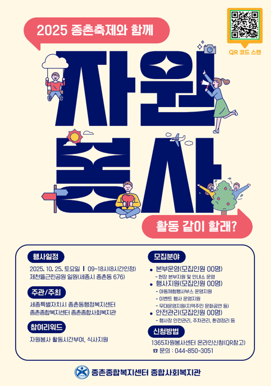 一、时间:2025年10月25日(星期六)9:00~16:00(计入8小时志愿时长)二、地点:堤川沼邻里公园一带(世宗市宗村洞676)三、招募岗位:活动本部运营、现场支援、安全管理四、报名方式:扫描海报上的二维码,填写Google表单五、咨询电话:044-850-3051