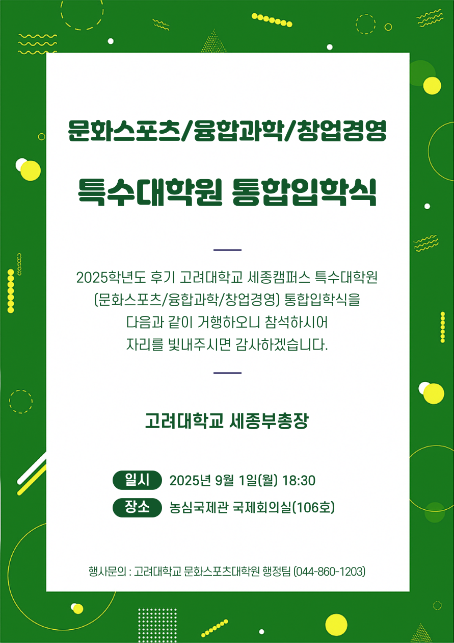 2025학년도 후기 특수대학원 통합입학식이 아래와 같이 개최되니 관계자 여러분의 많은 참석을 바랍니다.