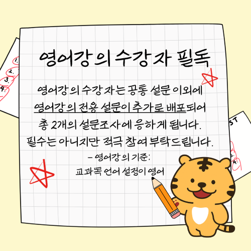 8. 학생 여러분의 영어 강의 만족도 파악을 위해 교과목 언어 설정인 영어인 경우 별도 문항이 추가 제공될 수 있습니다.