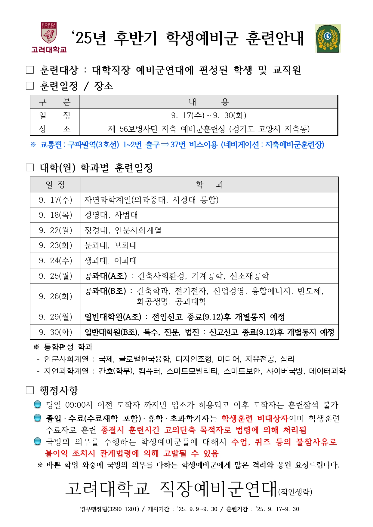 [기타]2025년 후반기 학생예비군 훈련일정 알림