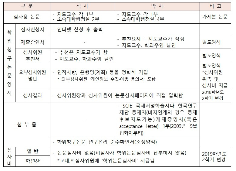 가. 제출서류 : 심사용 논문 및 서류를 소속 대학행정실에 제출