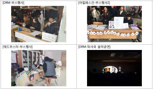 주요내용 | 각 분과별 소모임이 주최가 되어 행사를 진행하고 재학생들이 참여하는 정기 예술제 *[영화]소모임 아킬레스건 (단편영화 상영, 퀴즈 풀기, 감상평 공모) *[시창작]소모임 시숨 (창작문집 전시) *[작사]소모임 DRM (작사 공모전, 작사한 곡 공연) *[소설]소모임 미메시스 (스토리 공모전, 문집전시) *[비평]소모임 코기토 (프로이트 저서 철학 퀴즈, 나만의 명제 쓰기) *[연극]소모임 초대 (프로모션, 창작극 공연) *[광고]소모임 애드부스터 (상품 광고 홍보 문구쓰기) |