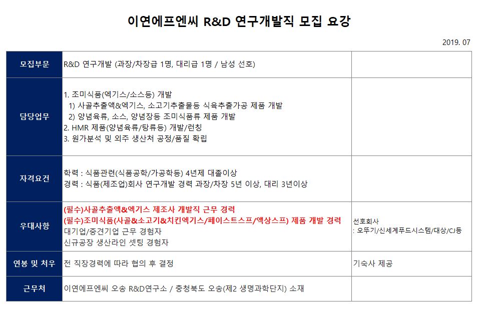 (주)이연에프엔씨 오송공장 연구개발직 채용