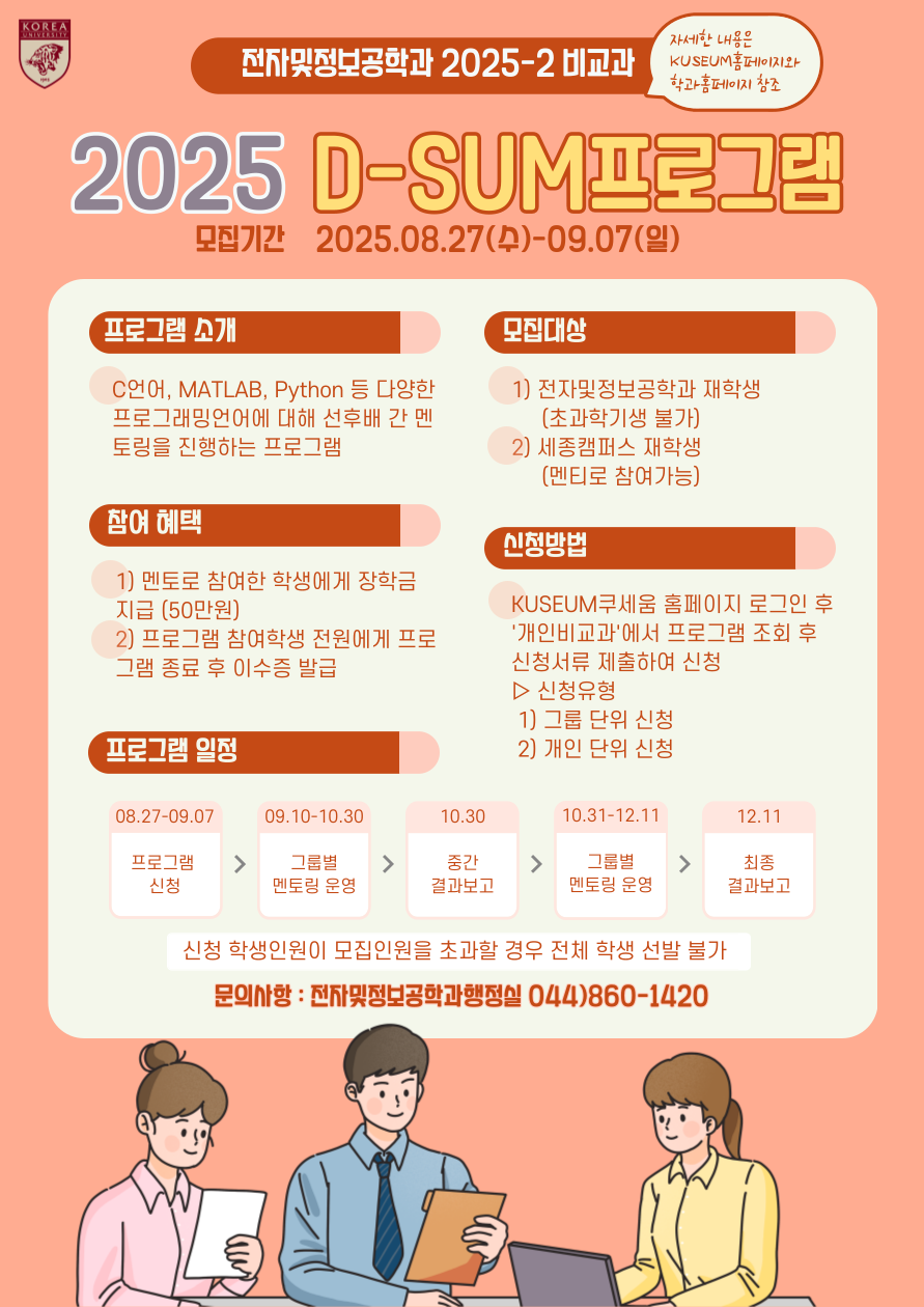 D-SUM프로그램은 팀을 구성하여 멘토링 진행하는 프로그램으로, 그룹 단위로 신청가능하지만 추가 팀원 구성이 이루어질 수 있음. 팀 구성을 희망하지 않을 경우 프로그램 참여 제한함.
