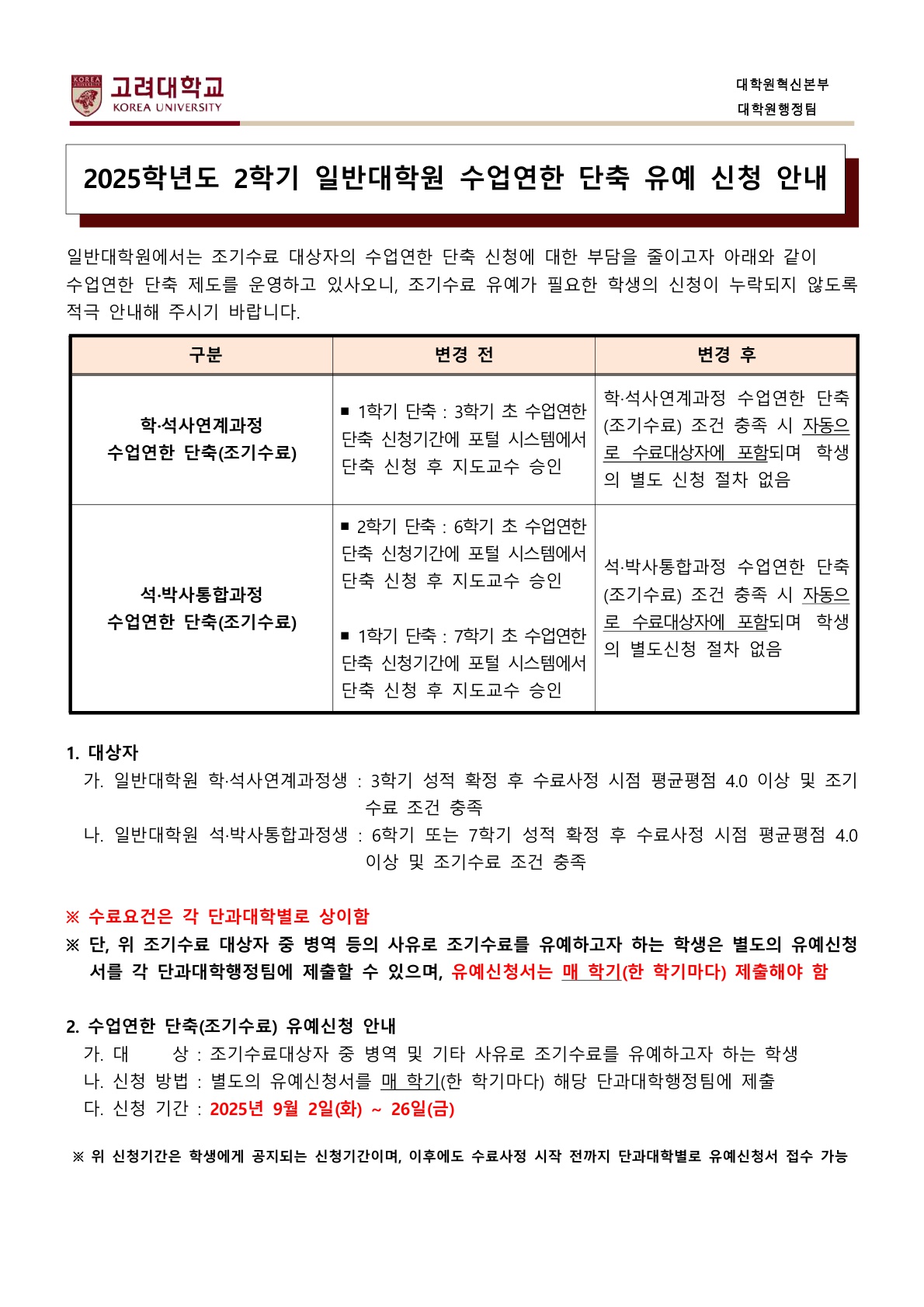 2025학년도 2학기 대학원 수업연한 단축 유예 신청 안내