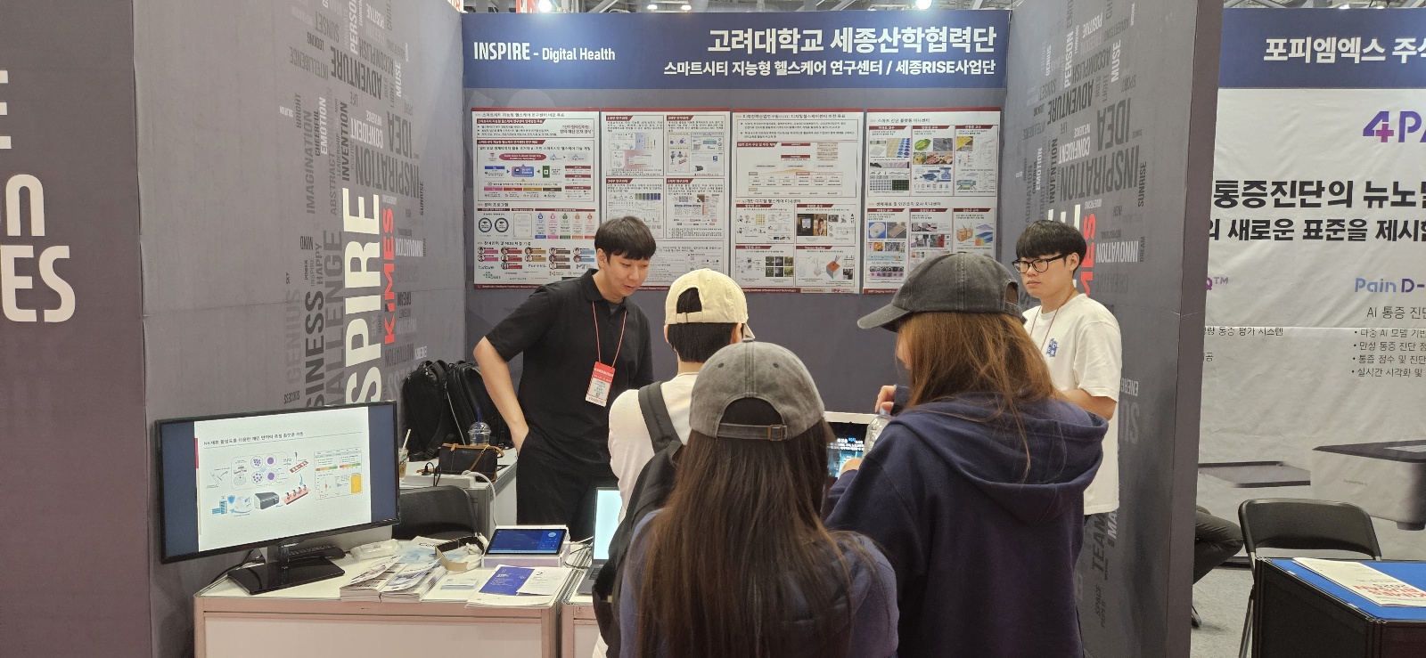 디지털헬스케어센터는 이번 전시회에서 자체 홍보 부스를 운영하며 고려대학교 세종캠퍼스의 연구 역량과 산학협력 성과를 소개하였다. 부스에서는 교수진의 연구 결과와 기술 개발 사례를 비롯해 협력 기업의 주요 제품 △메타이뮨텍의 Cellytics △비웨이브의 마음결 베이식 △페키체키의 반려동물 진단 키트 △픽셀로의 내눈키오스크 등을 함께 전시하였다. 학생들은 부스 운영 과정에 참여해 방문객들에게 연구 내용을 안내하고, 국내외 참관객들과 소통하며 현장 실무 경험을 쌓았다.
