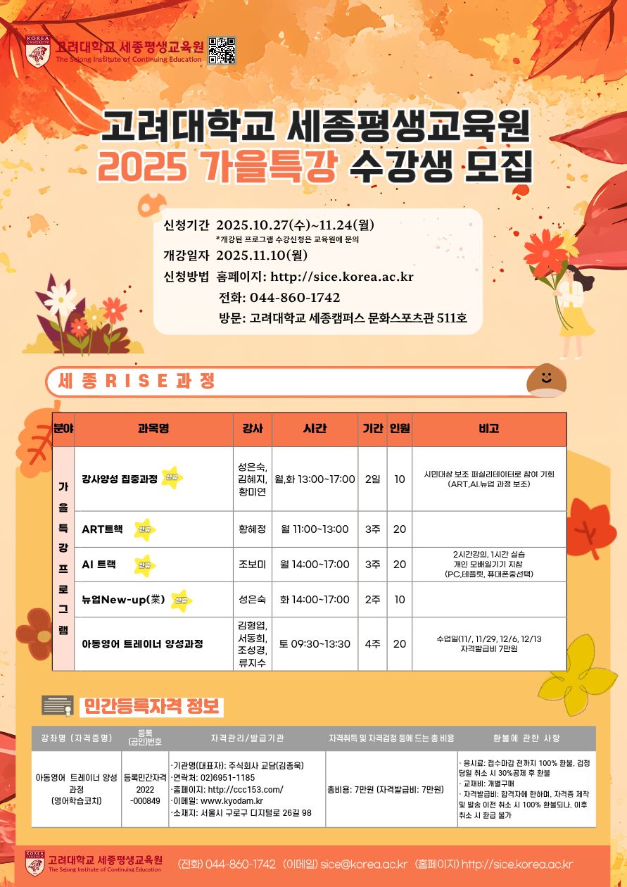 1. 수업개강 : 2025년 11월 10일(월)~11월 11일(화), 13:00~17:00