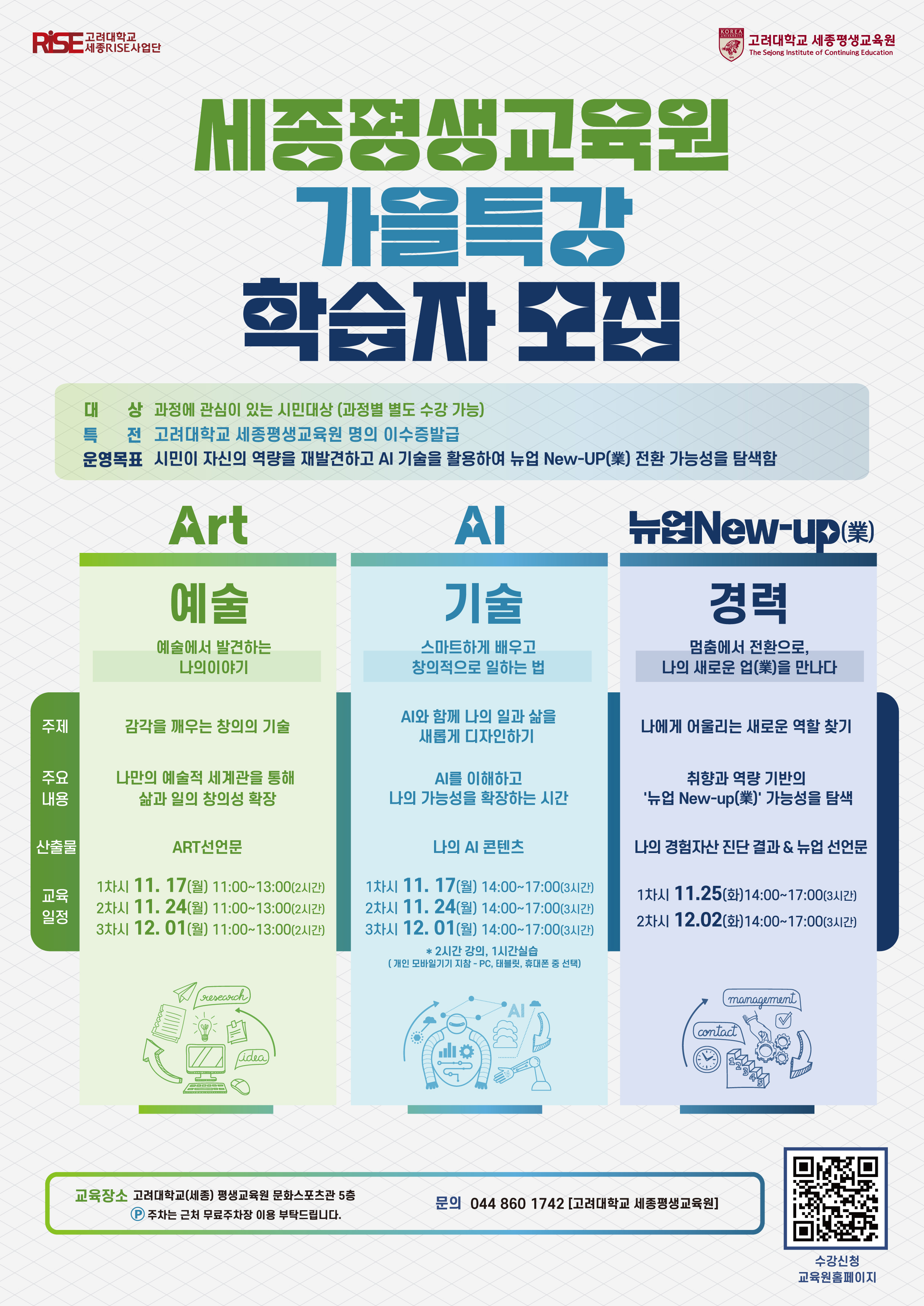 • 방문 세종특별자치시 세종로 2511 고려대학교 세종캠퍼스 문화스포츠관 511호