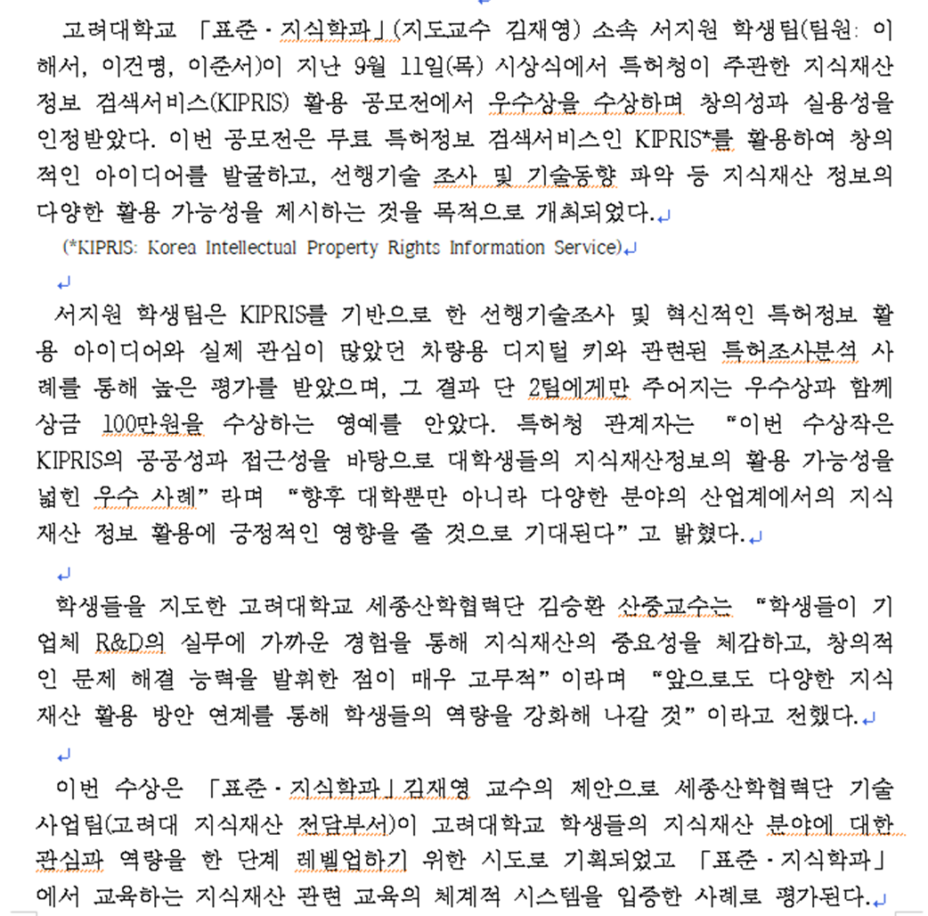 표준·지식학과 서지원 학생팀, 특허청 KIPRIS 공모전 우수상 수상