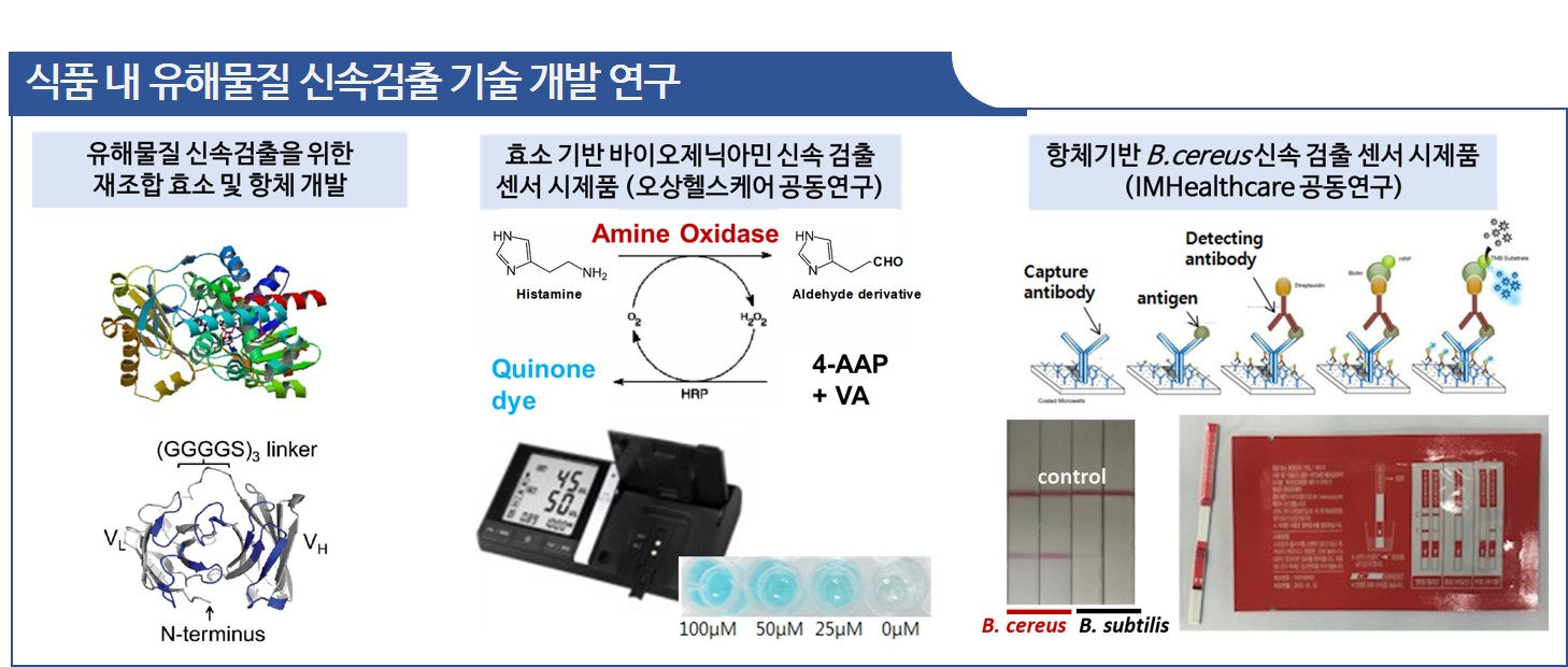 식품산업에서 안전성의 중요성은 갈수로 강조되고 있으며, 식품 내 유해물질을 분석하는 기존의 방법의 단점을 극복하고 신속하고 정확하게 검출할 수 있는 기술의 개발이 요구되고 있다. 본 연구실에서는 재조합 기술을 바탕으로 유해물질 혹은 식중독 미생물에 대한 특이적 효소 및 항체 개발을 통해 신속검출 기술 개발 연구를 진행하고 있다. 개발된 효소 및 항체의 산업적 적용을 위해 국내 의료용 센서 생산회사로의 기술이전 및 공동연구를 진행하고 있으며, 식품 제조현장에서 간편하게 분석이 가능한 바이오센서 개발을 추진하고 있다.