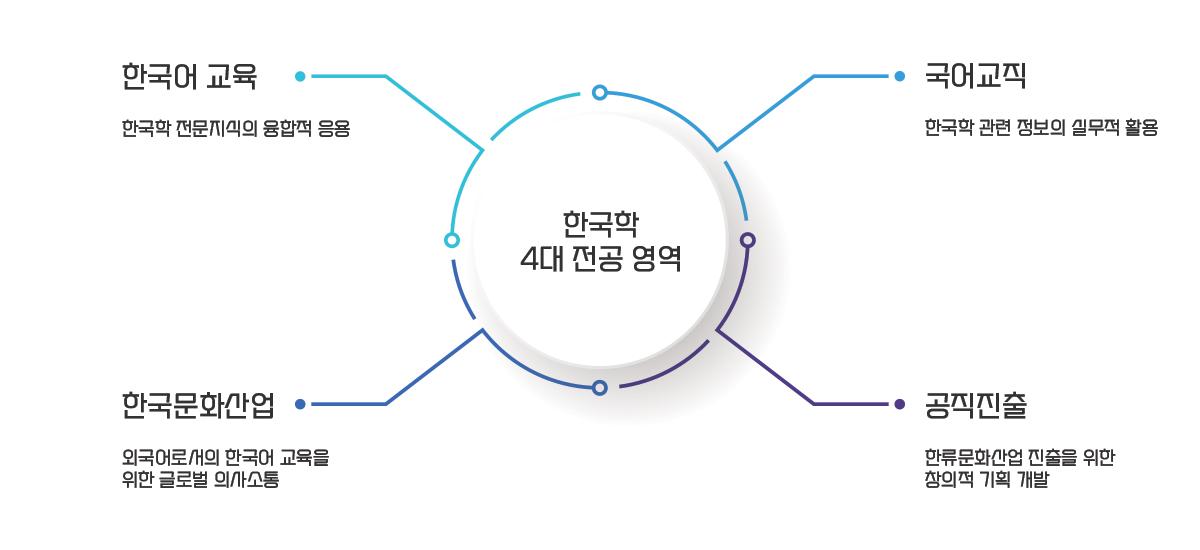 한국학전공에서는 우리 문화를 탐구하고 우리 문화로 세계와 소통하는 방법을 연습합니다. 한국학전공 학생들은 한국의 전통문화, 대중문화, 미디어문화, 문화산업, 한류문화, 문화비평, 문화기획, 언어문화, 역사문화, 한국어교육, 문화정보화 등을 체계적으로 배워 우리 문화에 대한 종합적인 지식과 문화적인 통찰력을 갖춥니다. 그리고 급변하는 국내외의 문화 환경을 읽는 다양한 연습을 통해 사회 변화 및 문화 변동에 능동적으로 대처할 수 있는 시대적 문제의식과 진취적인 문제 해결 능력을 기릅니다. 한국 문화의 숨은 가치를 탐색하고 확장시키는 과정은 늘 신나고 흥미진진합니다.