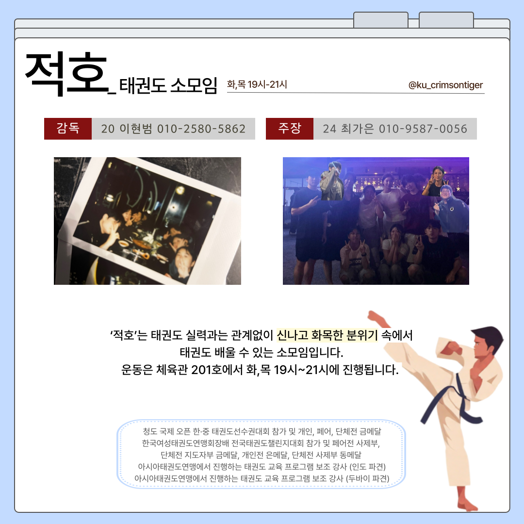 - 태권도 소모임 ‘적호’는 2003년 창설되어 현 17년째 이어져 내려오는 소모임입니다. ‘적호’는 실력 향상 및 친목 도모를 목적으로 홍익대학교를 비롯하여 타 대학들과 꾸준한 교류전을 가지고 있으며, 교내 축제인 OPEN HOUSE, 대동제, Fitness Festival에 참여하여 태권도 시범 공연을 하는 등의 활동을 하고 있습니다. 또한 매년 승단 심사 응시를 통해 소모임 부원들이 단증을 취득할 수 있도록 하여 졸업 자격증에 관하여 학우들을 돕고 있습니다. ‘적호’는 개인의 실력을 향상시키는 데에 그치지 않고, 매년 대학 태권도 동아리 대회에 참가해 겨루기, 품새, 시범 경연 부문에서 우수한 성적을 거두고 있습니다. ‘적호’는 가족 같은 분위기 속에서 운동을 하는 대표적인 소모임으로, 졸업한 선배님들과도 학기 중, 방학 중에도 정기적인 모임으로 친목을 다지며 선후배 이상의 끈끈한 가족애로 뭉쳐 있다고 자부합니다.