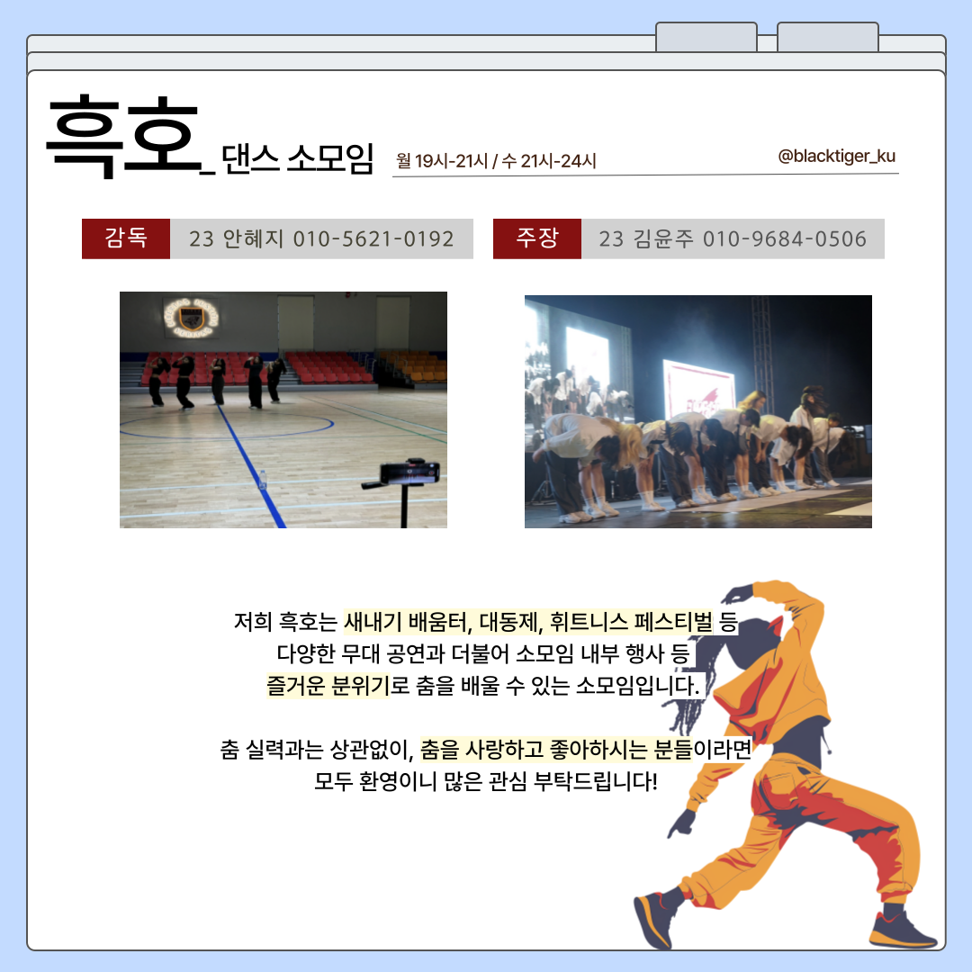 - 고려대학교 국제스포츠학부 댄스소모임 “흑호”입니다. 흑호는 케이팝 댄스, 힙합, 스트릿 댄스 등 장르를 불문하고 연습하며 정기적으로 무대에 오르고 있습니다. 1학기에는 대동제와 오픈하우스, 2학기에는 휘트니스페스티벌 무대를 준비합니다. 다양한 교외 무대나 대회를 준비하기도 합니다. 선후배간 가족 같은 분위기의 친밀도로 자유로운 연습을 추구합니다. 타과생들뿐만 아니라 교외 사람들에게도 학부의 이름을 알릴 수 있는 비중이 큰 소모임으로 거듭나기 위해 노력하고 있습니다.