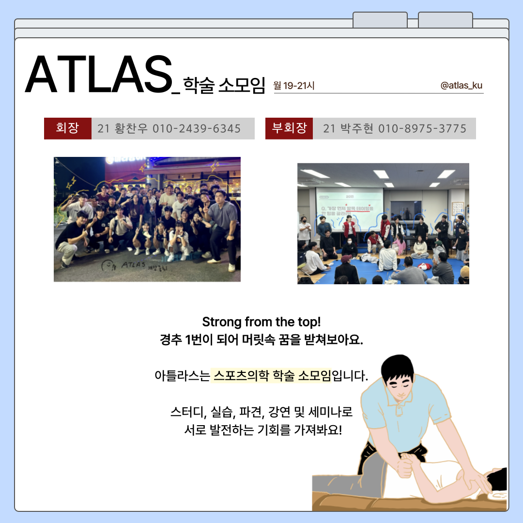 - 스포츠의학은 스포츠에 있어 꽃이라고도 할 수 있습니다. 발전되는 스포츠에서 스포츠의학이 점점 영향이 커지고 상당한 부분을 차지하고 있습니다. 기초적인 학문뿐만 아니라 더 심오하고 다양한 부분을 공부하며 토론 및 실습까지 이어가고 있는 스포츠의학 동아리입니다. 단순히 스포츠의학을 공부하는 학생들이 아닌 스포츠의학을 개척해나가고 많은 것에 도달하고 이루며 미래를 바꿀 학생들이기에 항상 스포츠의학을 위해 열심히 나아가고 있습니다.