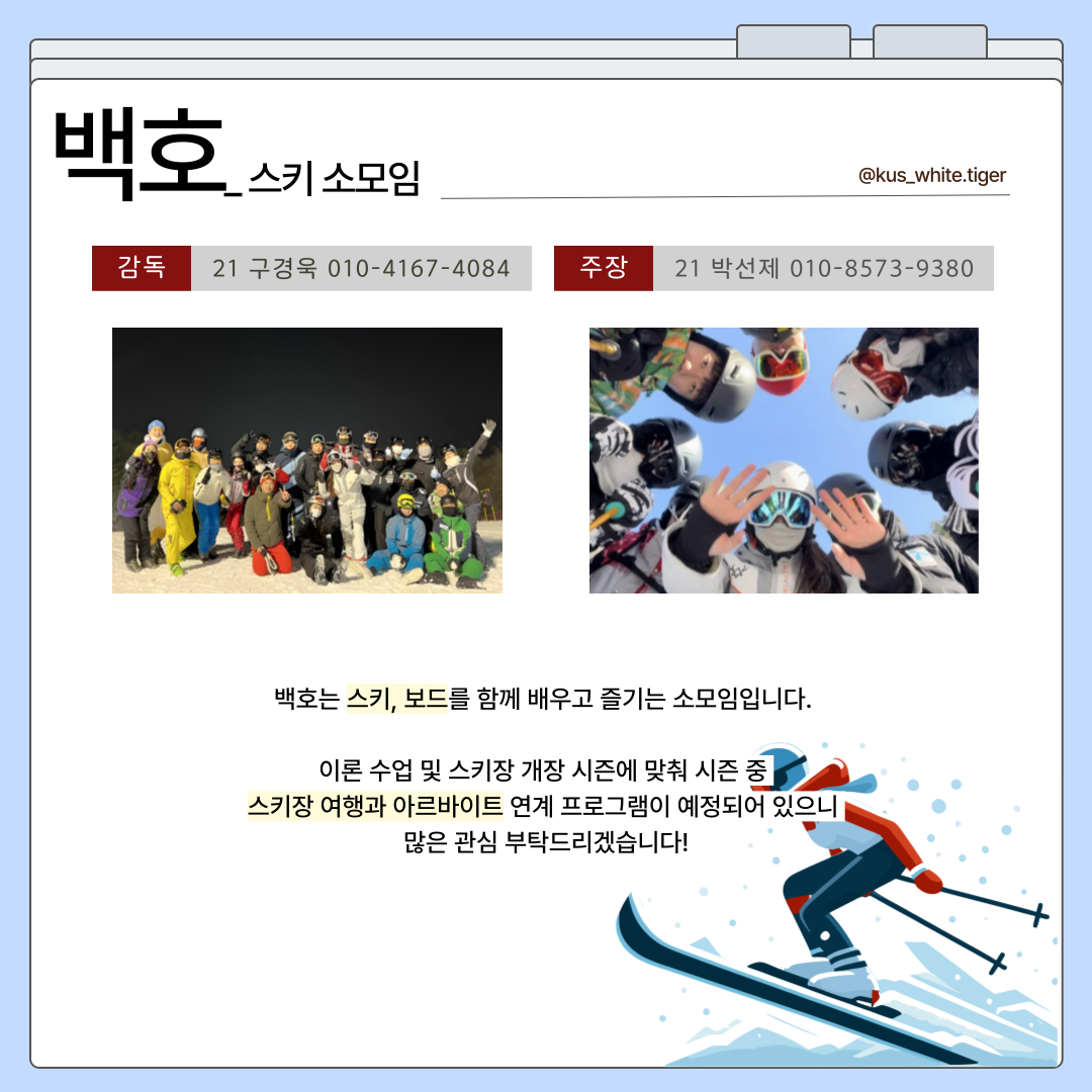 - 백호는 1991년 시작한 소모임으로 겨울을 대표하는 학과 소모임입니다. 매 주 이론교육 및 실습을 통한 자세운동을 진행하며 2박 3일 겨울합숙을 통하여 직접 스키, 보드를 배울 수 있는 소모임입니다. 더 나아가 소모임원들이 직접 강습생을 지도할 수 있는 강사로써의 활동 또한 리조트와 연계하여 겨울방학에도 진행되고 있습니다.